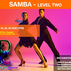 This May, it's time to elevate and better understand Samba! If you’ve been coasting a little in your dancing lately, this class won’t let you. Samba demands more from dancers. Quicker reactions, stronger legs, sharper timing, and the ability to stay grounded while everything else feels like it’s moving. This class is for dancers who already have a base and are ready to push past it. It’s not about getting through the steps. It’s about building the kind of control that makes fast movement feel intentional instead of rushed. 🗓 Dates: Saturday nights: May 9, 16, 23 & 30 2026 🕗 Time: 7:00 – 7:50 PM 📍 Location: Ballroom & Country Dance Studio (121C 17th Ave NE, Calgary) 🎟 Pricing: $20 Drop-In (available only for the first class) $60 Full Course (single registration) $100 Full Course (per couple) What Is Samba? Samba is a lively, rhythm-driven Latin dance that captures the pulse of Brazil’s Carnival spirit. Characterized by its bounce, body rhythm, and joyful expression, it’s the perfect way to build your coordination and musicality, all while getting a fun, full-body workout. Some previous experience is recommended, but is not mandatory. Please note, we will be moving at an intermediate speed. ✨ Learn from award-winning instructor Christifer Duxbury and experience the joy, rhythm, and movement that only Samba can bring. 📞 587-404-4810 (text preferred) 📧 info@cddancecollective.com 🌐 www.cddancecollective.com